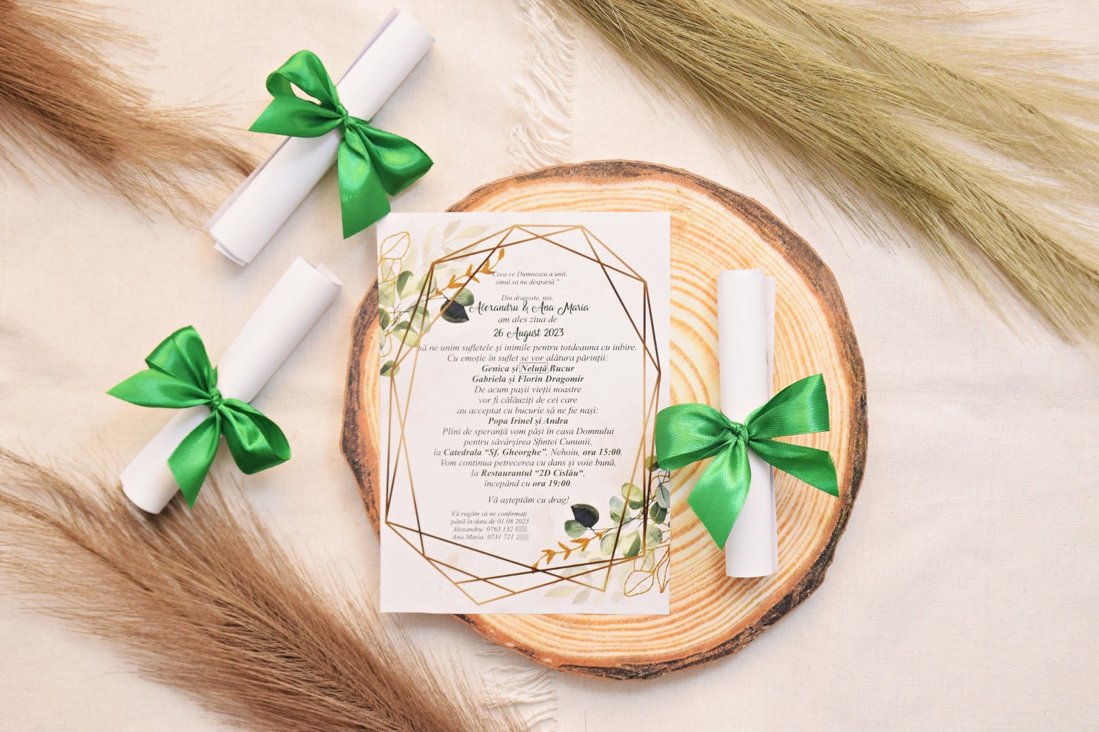 Invitație de nuntă rulată, elegantă, lucrată manual, imprimată pe carton alb de 300g cu dimensiunea de 13x18cm, accesorizată cu fundiță în culoarea dorită și grafică personalizată.