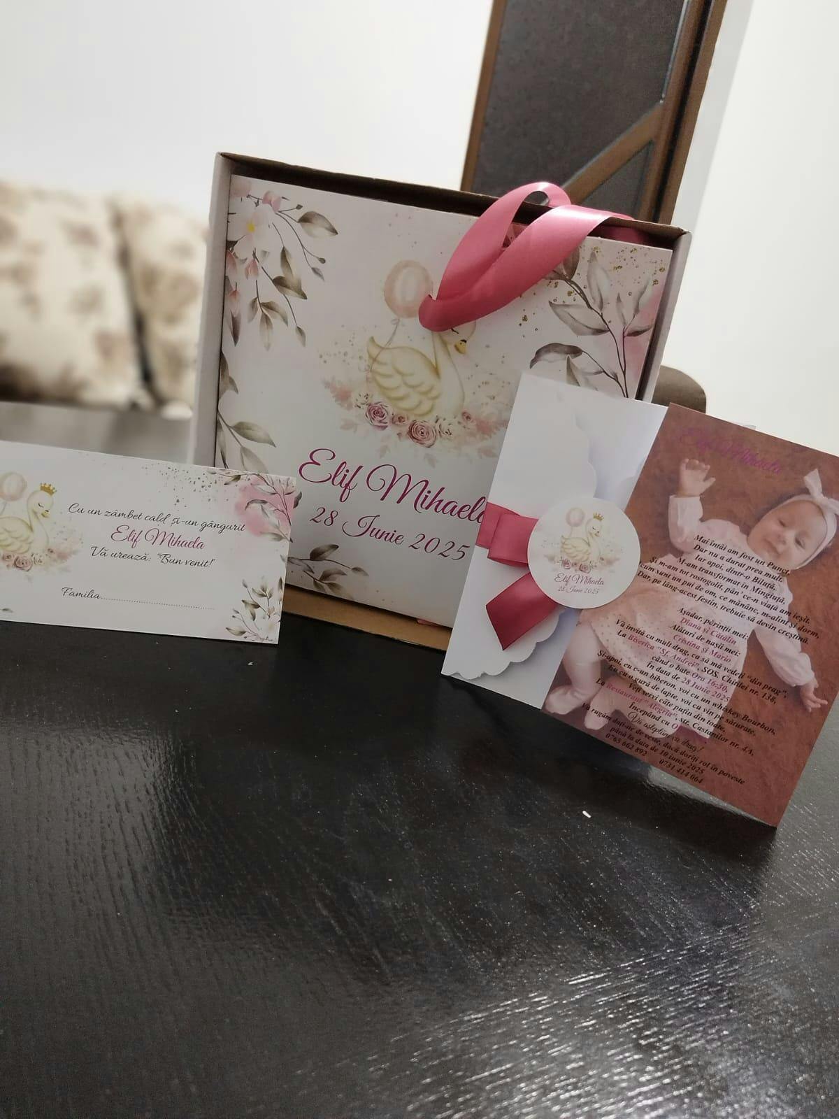 Invitație de Botez cu plic, fundița și eticheta personalizată cu tema Lebada.