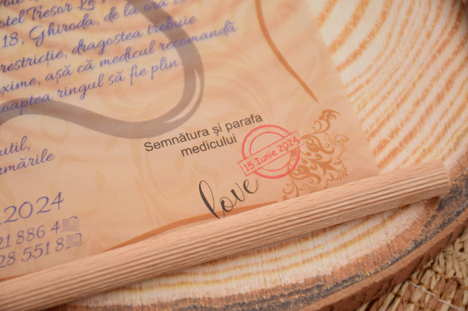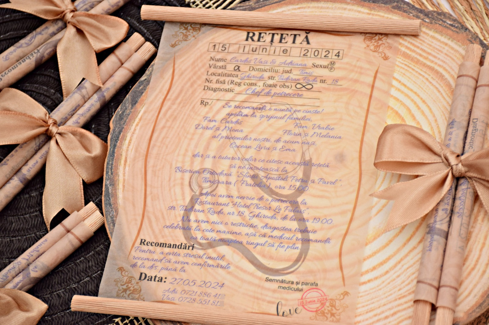 - invitație printată pe hartie de calc si rulata manual pe betisoare de lemn