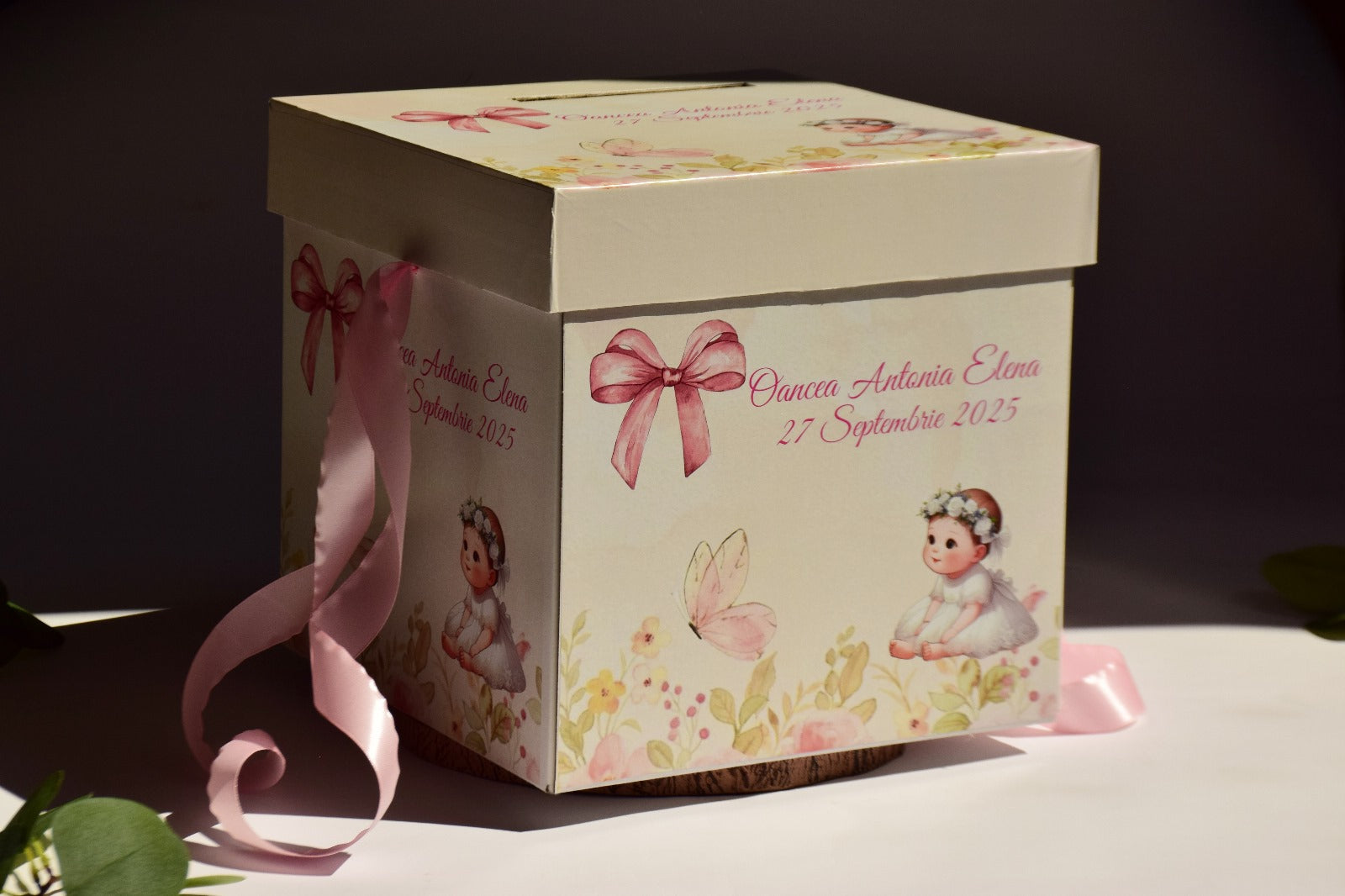 Realizată manual din carton rezistent, cu dimensiunea de 25x25x25 cm, această cutie de bani este perfectă pentru evenimente speciale.