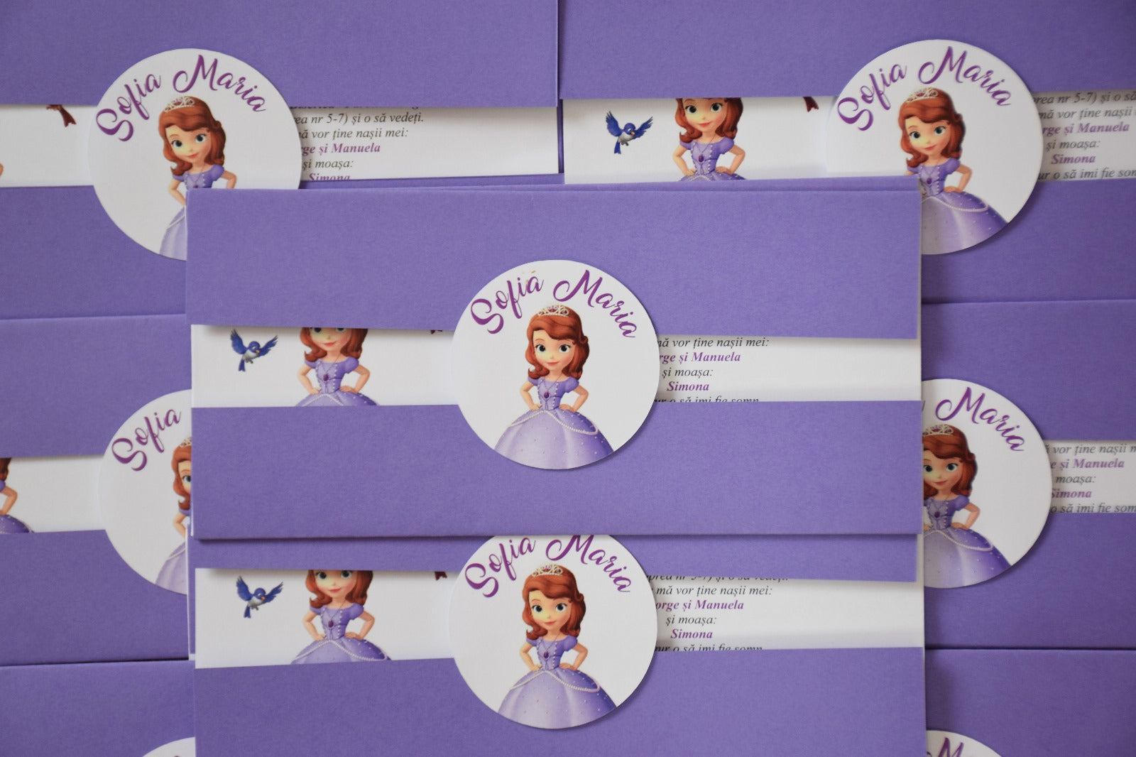 Invitație de botez personalizată cu plic și etichetă cu tema Sofia!