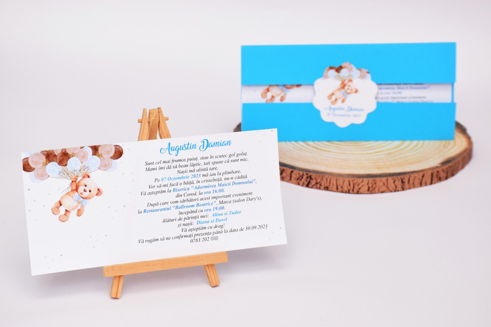 Invitație de botez personalizată cu plic și etichetă cu tema Ursuleț!
