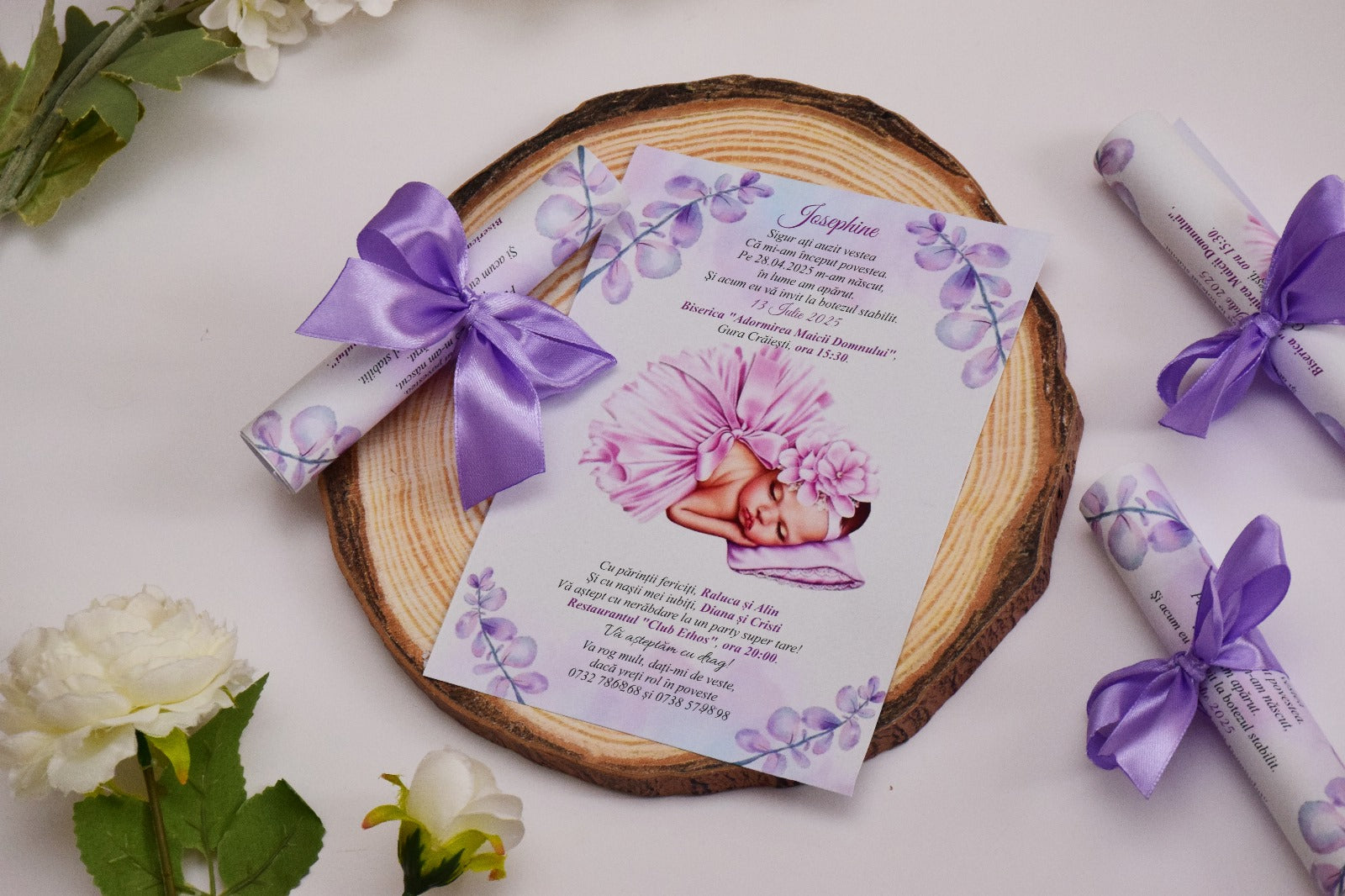 ✨ Oferă invitaților o experiență inedită cu invitația de botez rulată cu fundiță, un simbol al rafinamentului și al atenției la detalii! Acest model unic este printat pe carton de 160g cu dimensiunea de 13x18cm rulat manual, oferindu-i un aspect elegant și sofisticat.✨