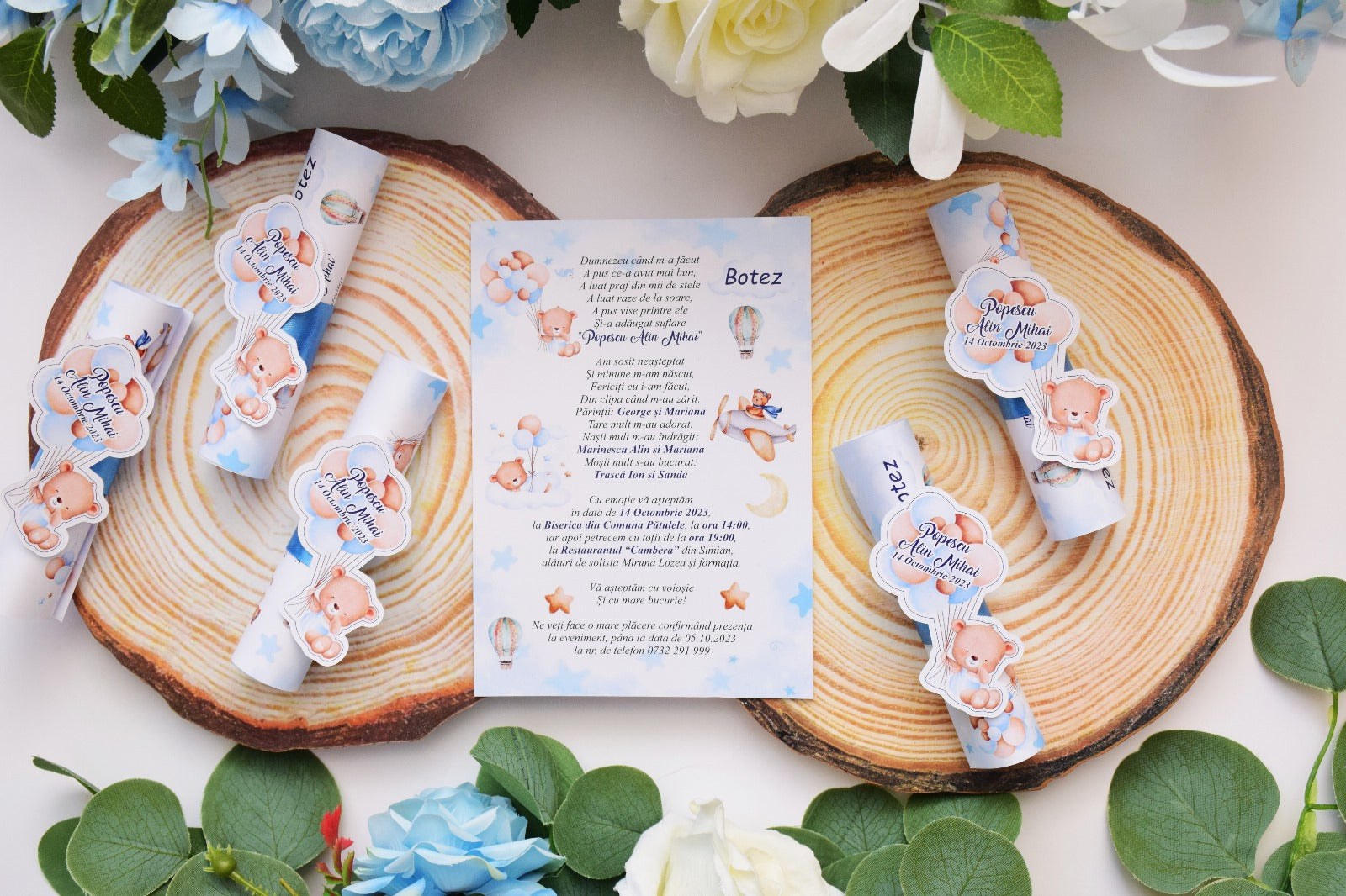 🎀 Invitație de Botez Rulată accesorizată cu decorațiune, tema Ursuleț 🎀
