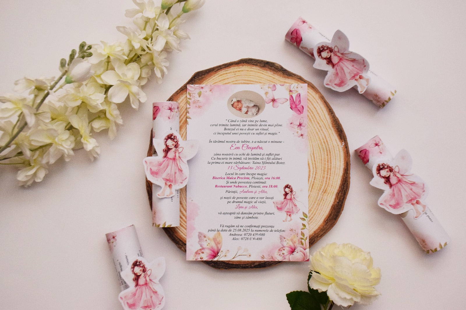 🎀 Invitație de Botez Rulată accesorizată cu decorațiune, tema Zână 🎀