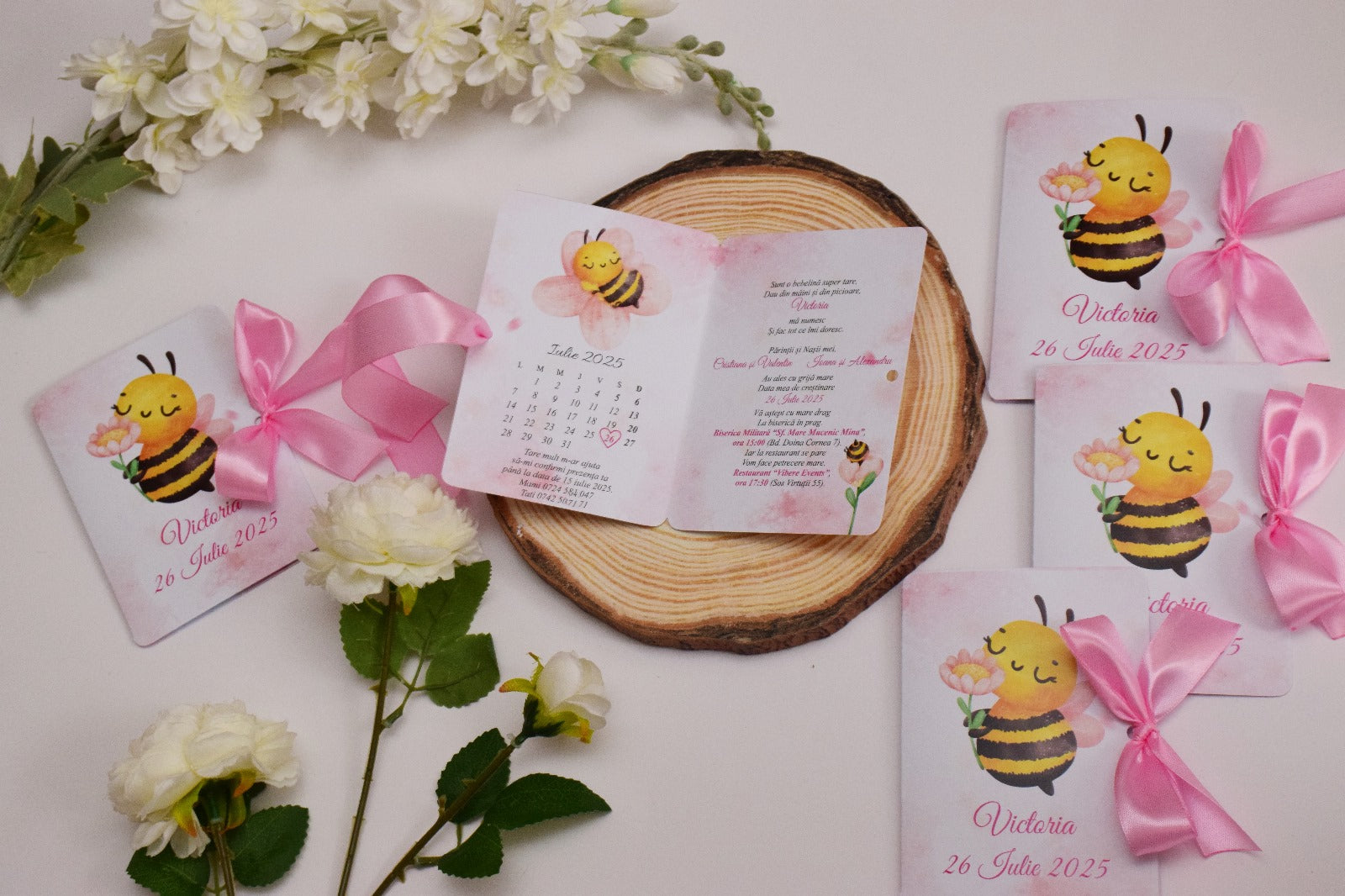 🎀 Invitație de Botez tip Cărticică cu Fundiță - Tema Albinuță🎀