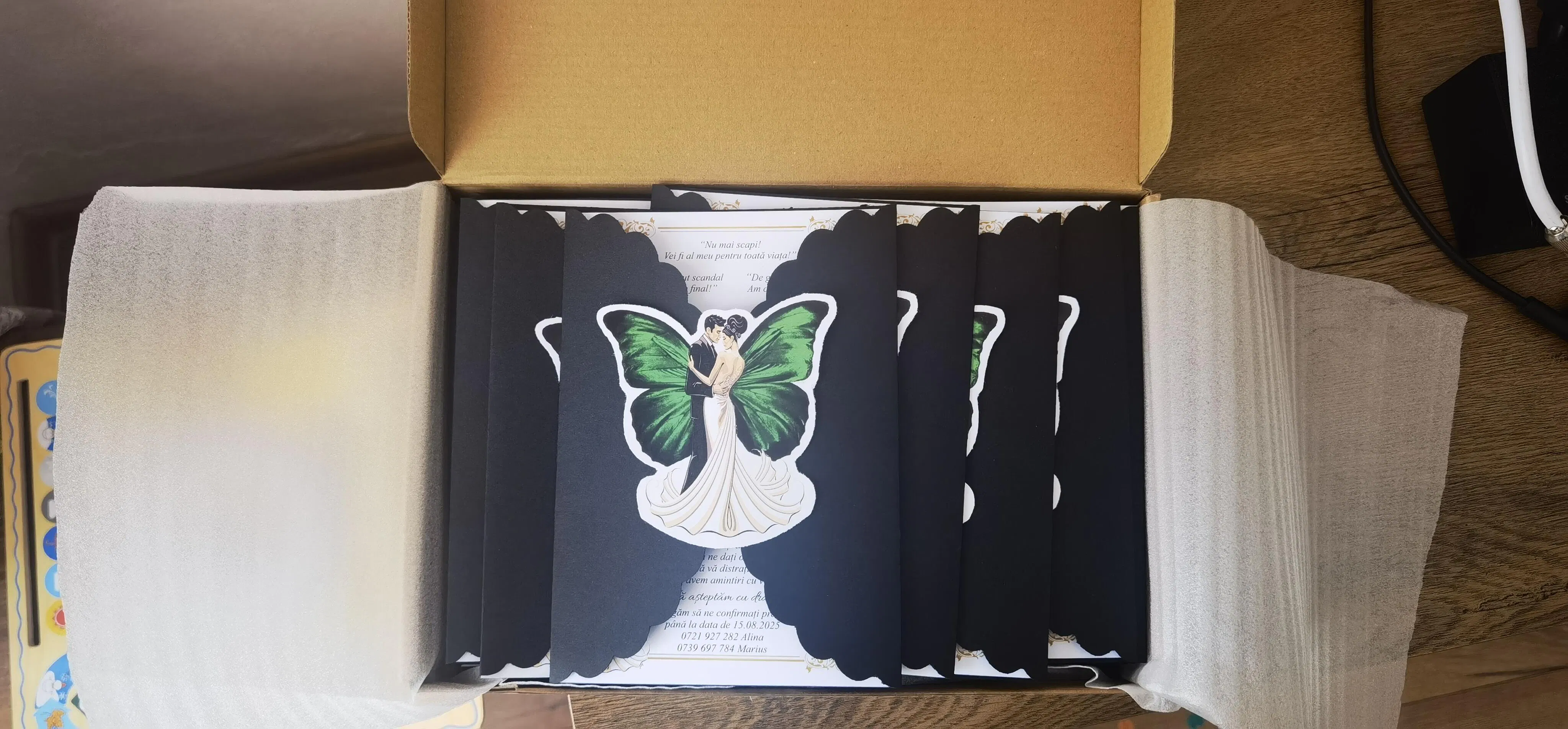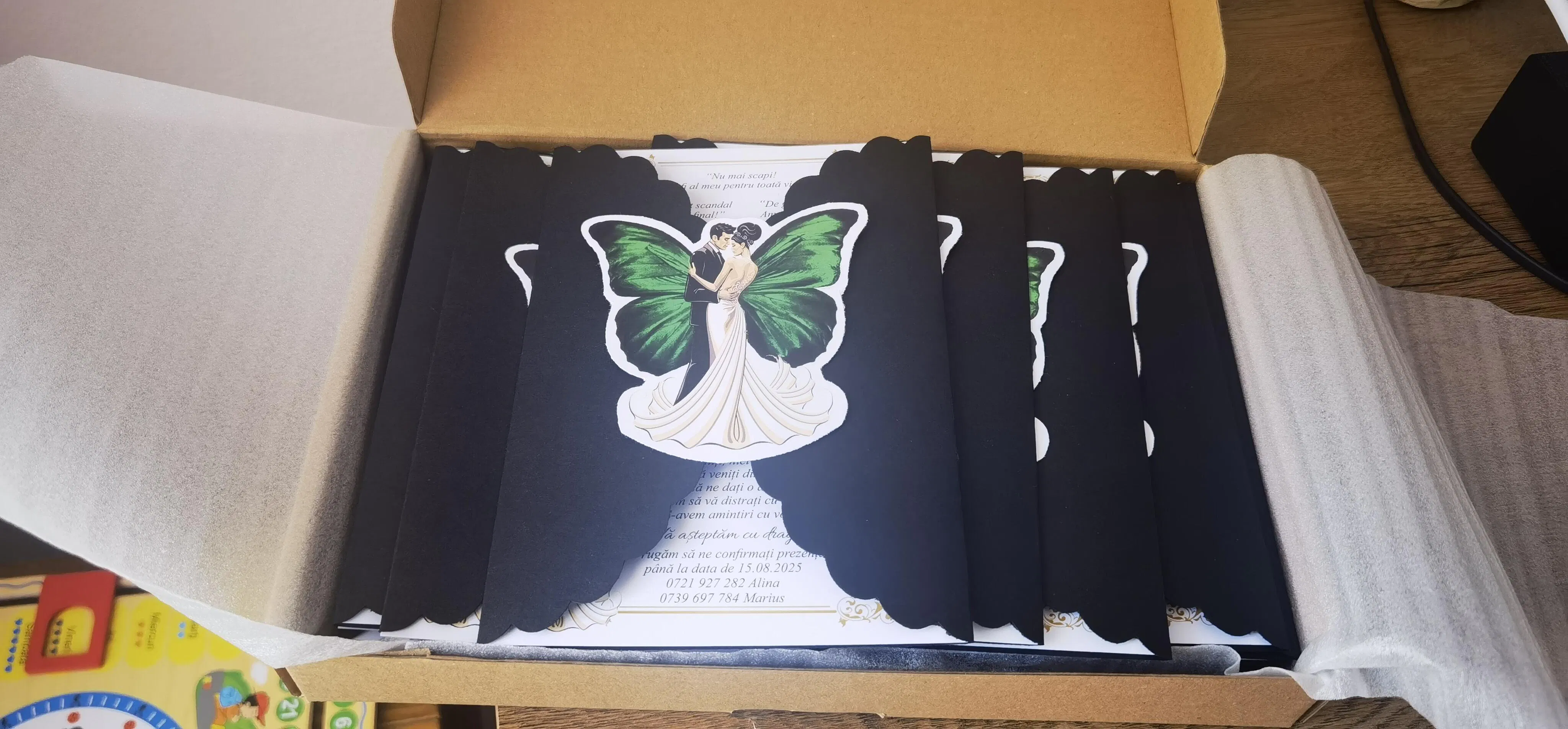 - invitație executată manual printată pe carton alb 300g cu dimensiunea 13x18cm,