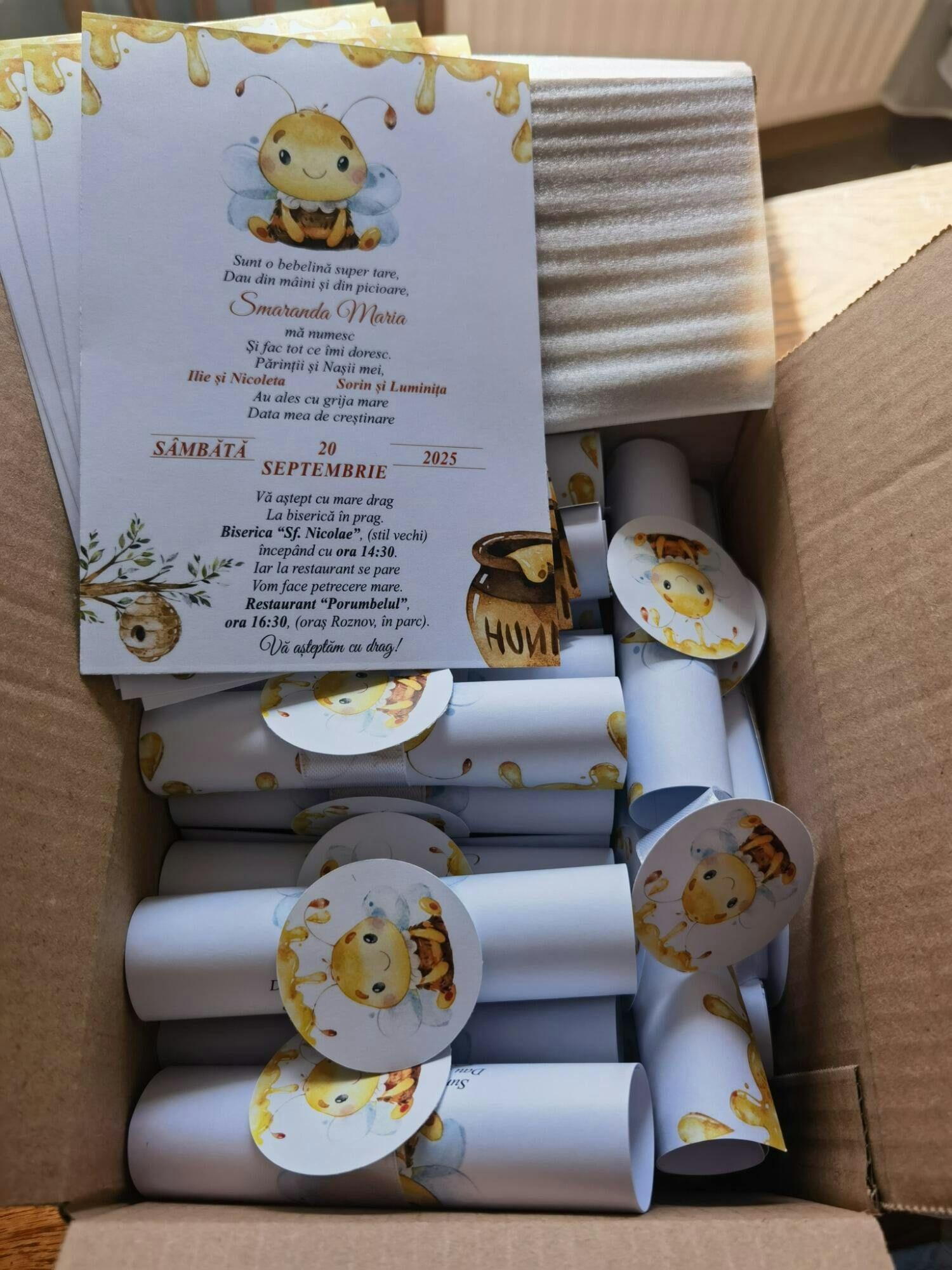 Invitație de botez rulată cu fundiță și insignă personalizată cu tema Albinuta.