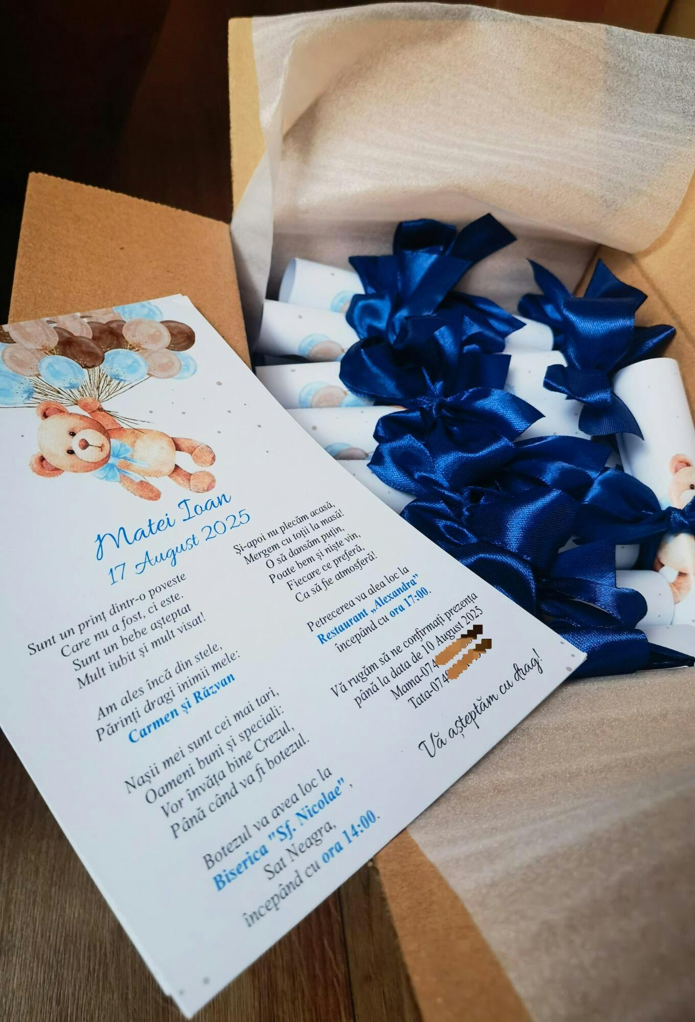Invitație de botez rulata cu fundița personalizată.