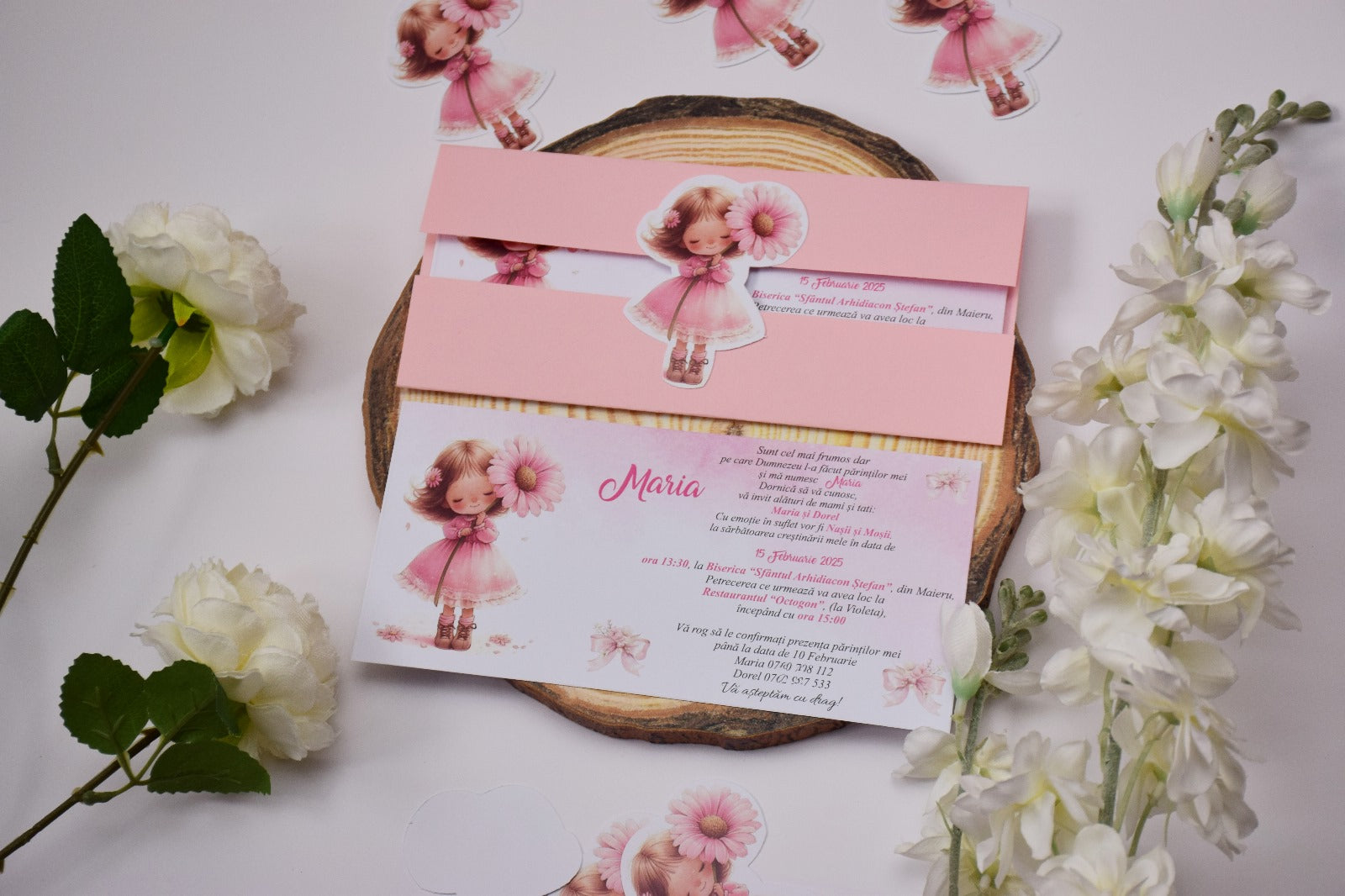 Invitație de botez personalizată cu plic și etichetă fetița cu floare handmade!