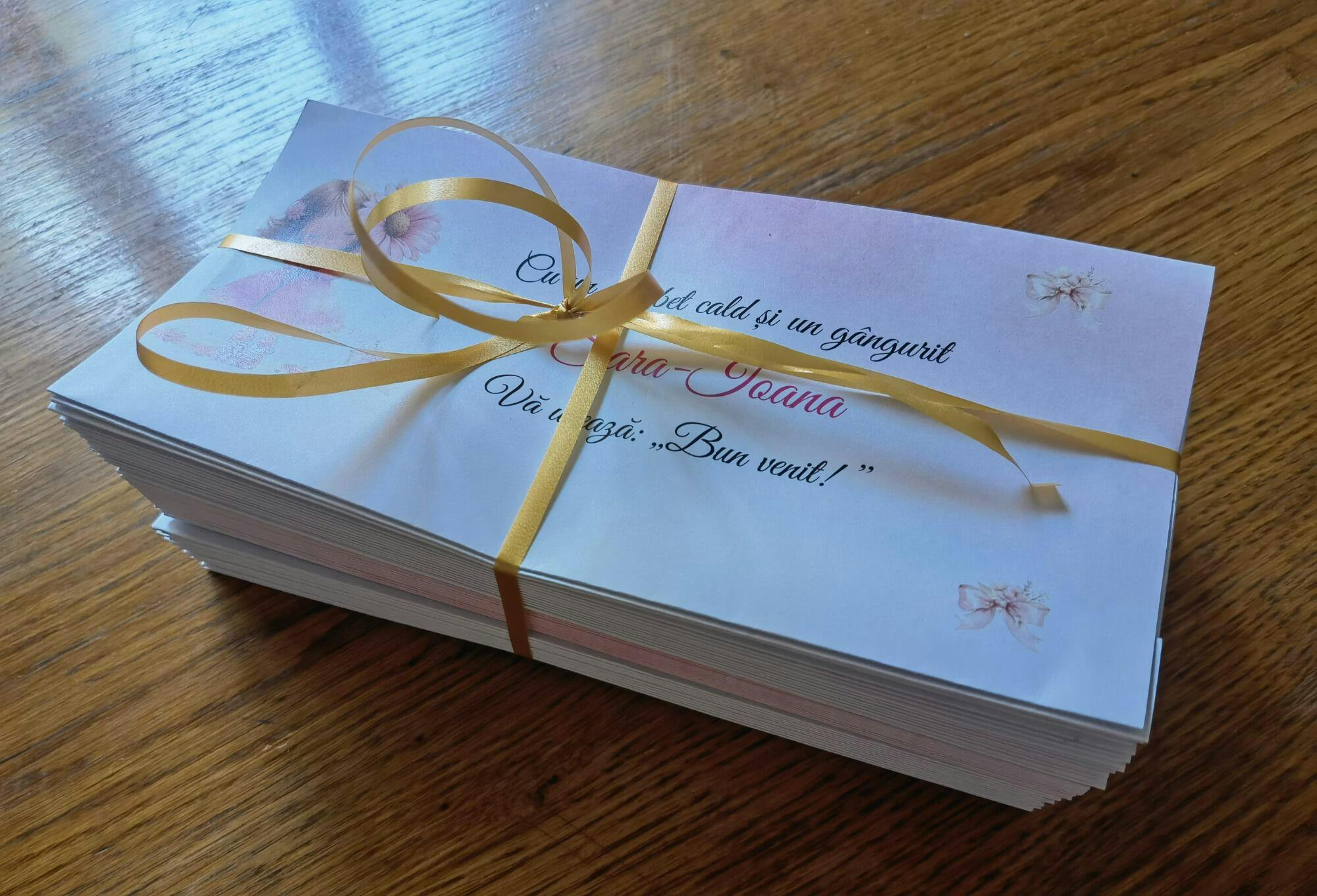 Plic și etichetă: Culorile sunt personalizabile, iar serviciul include tipărirea și asamblarea cu grijă a fiecărui element.