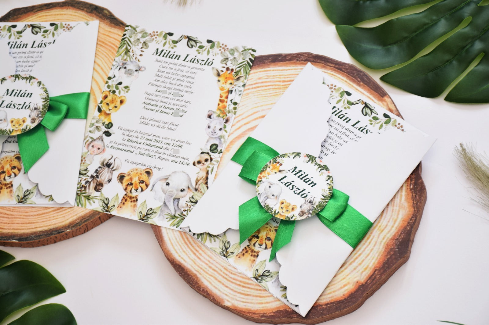 🎀 Invitație de Botez cu Plic, Fundiță si decorațiune cu tema Junglă 🎀
