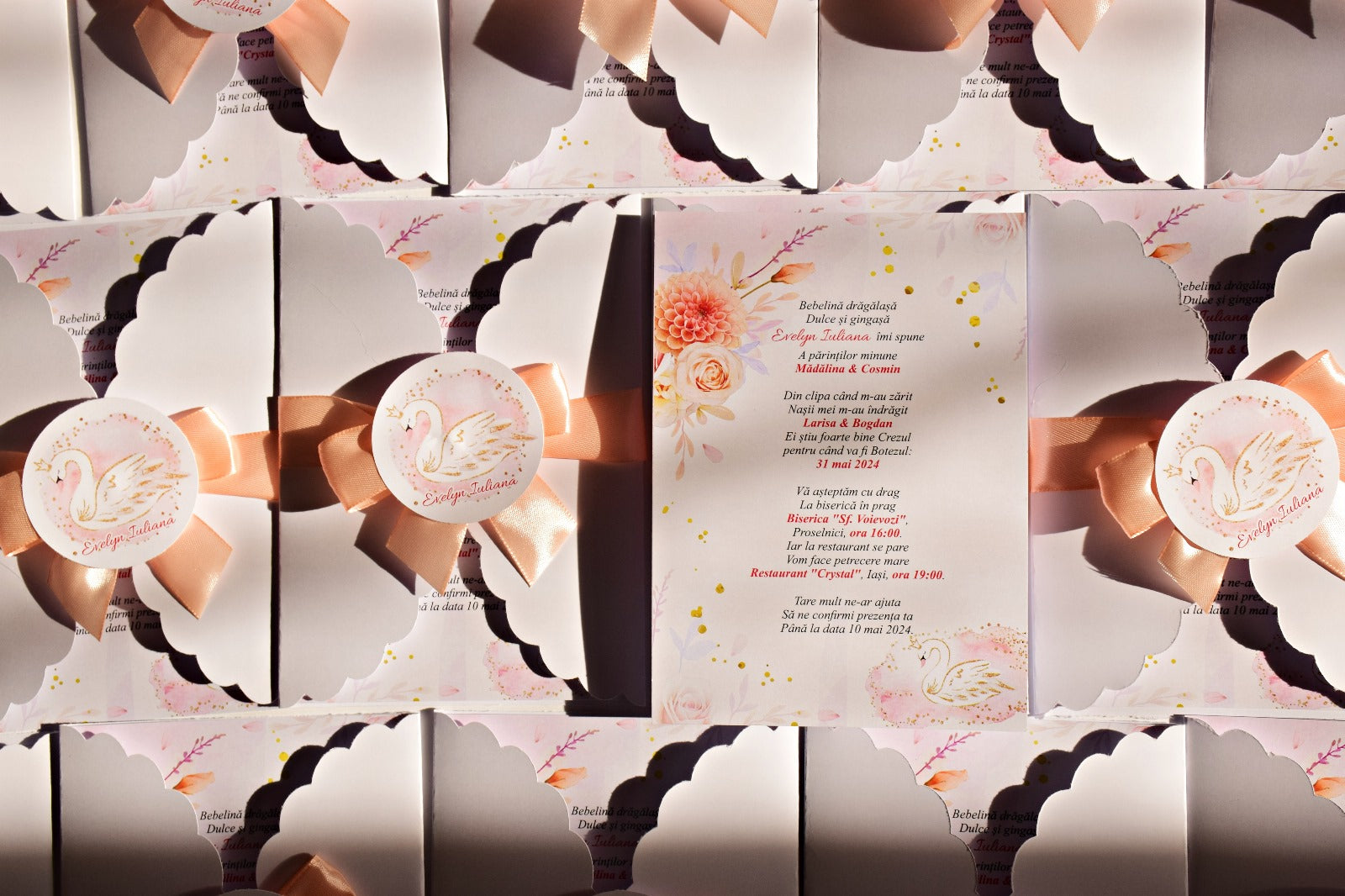 Invitatie Botez cu Plic si Fundita, tema Lebada - Model B128