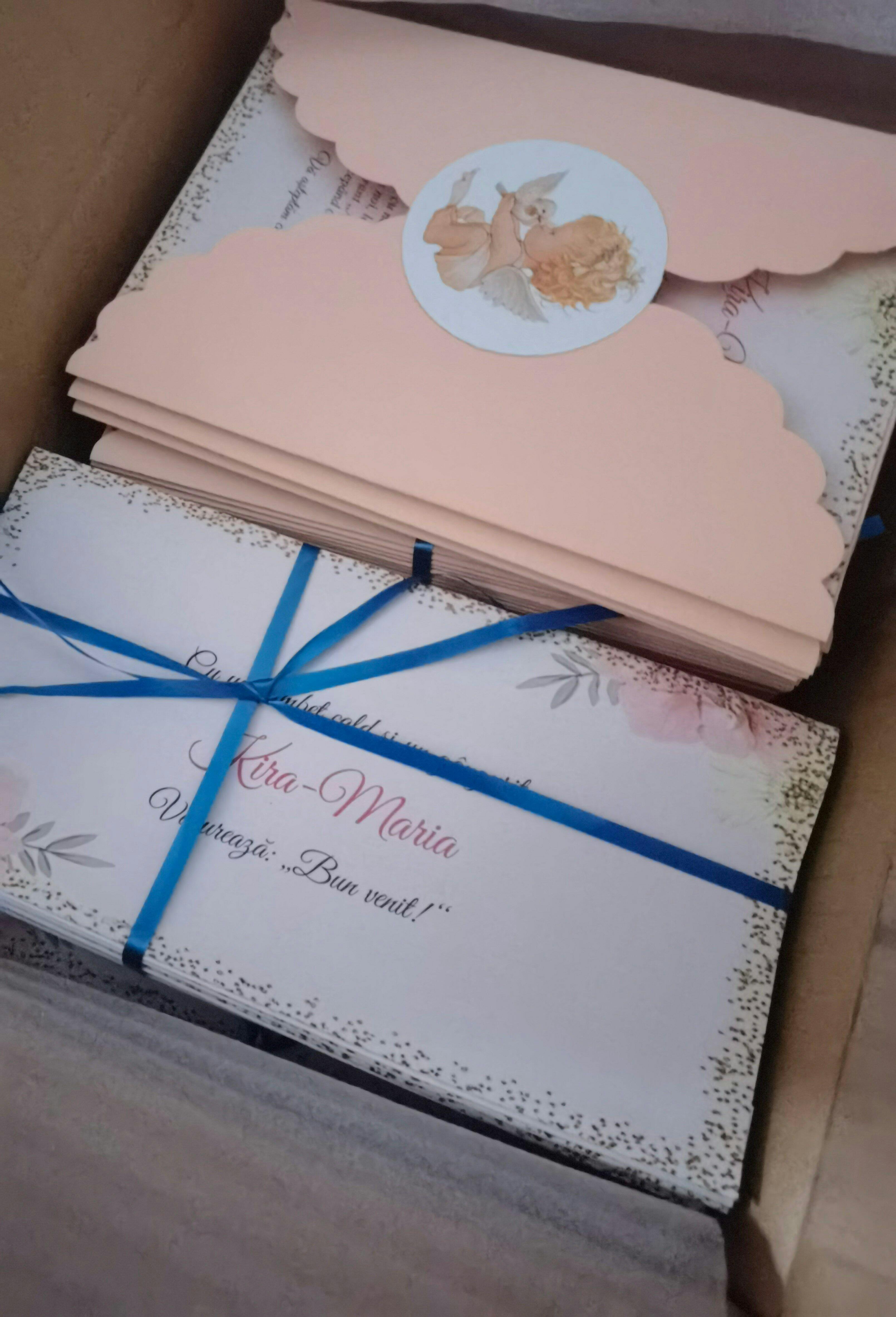 ✔️ Invitație printată și asamblată manual – dimensiune 13x18 cm, pe carton alb de 300g