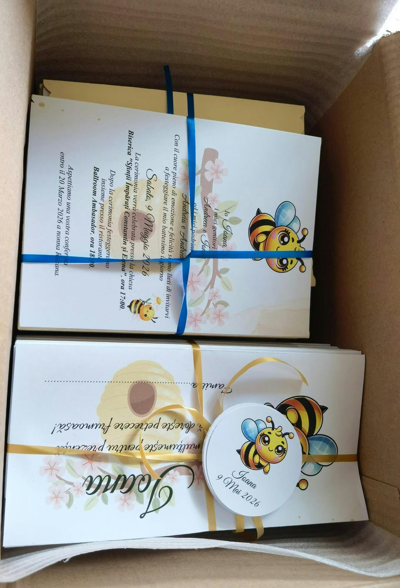 O invitație adorabilă și personalizată cu tematica Albinuță, imprimată pe carton alb de 300g, asamblată manual și accesorizată cu decorațiune tematică.