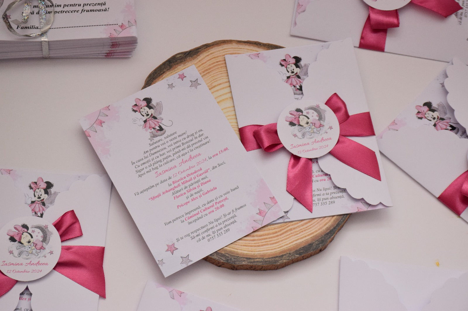 Invitatie Botez cu Plic si Fundita, tema Minnie - Model B132