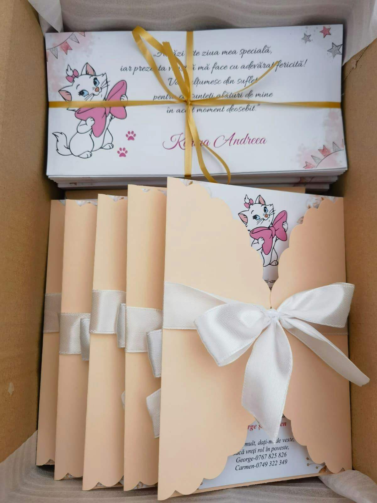 Celebrează primul an din viața micuțului tău cu o Invitație de Moț realizată manual pe carton alb de 300g, cu tematică Pisicile Aristocrate și grafică personalizată cu poza copilului sau un design jucăuș ales de tine.