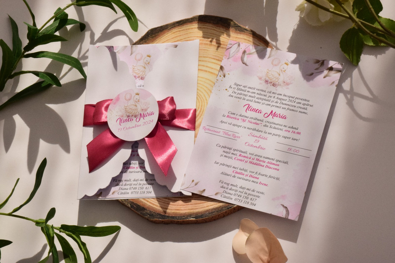 🎀 Invitație de Botez cu Plic, Fundiță si decorațiune cu tema Lebada 🎀