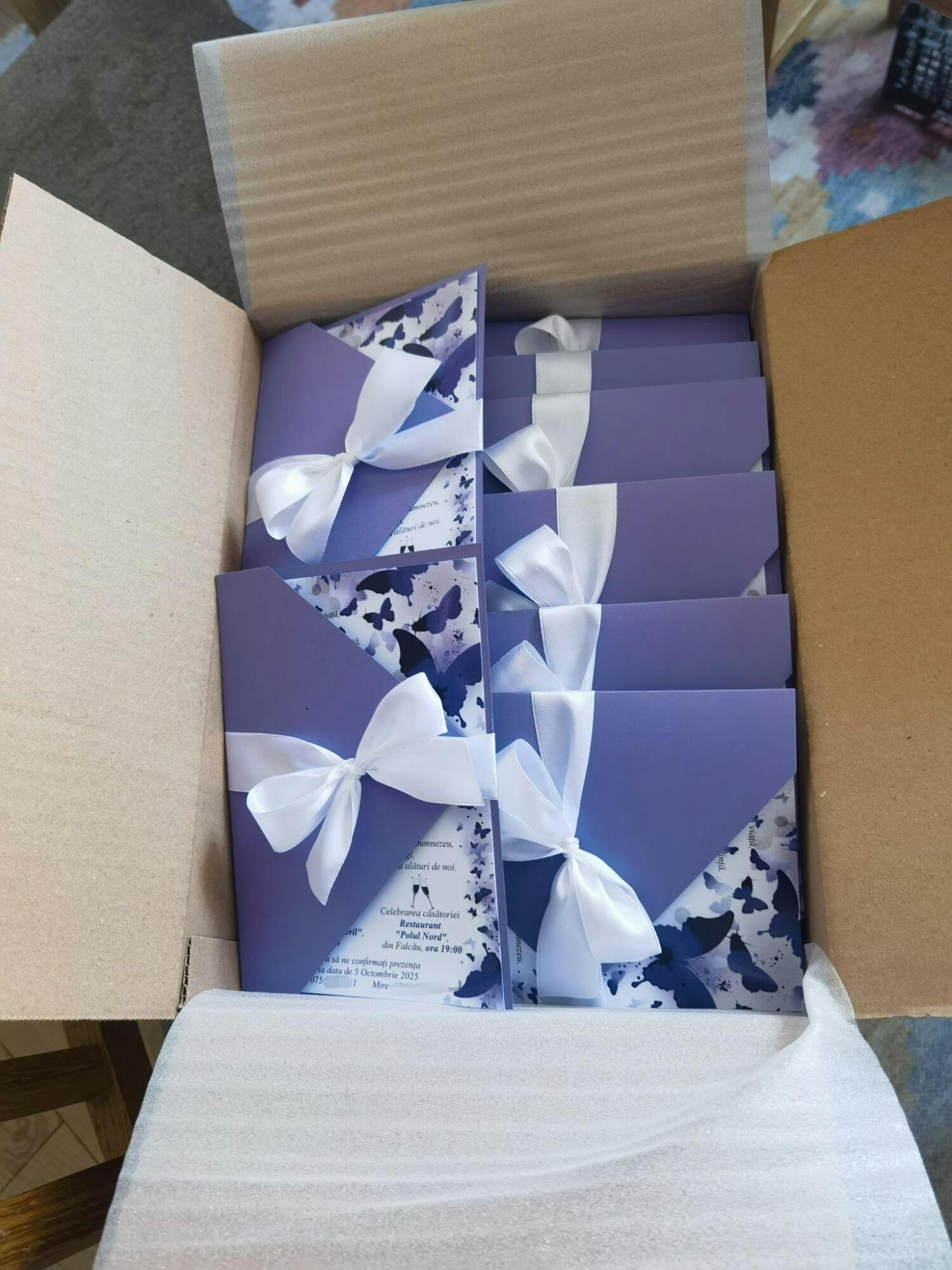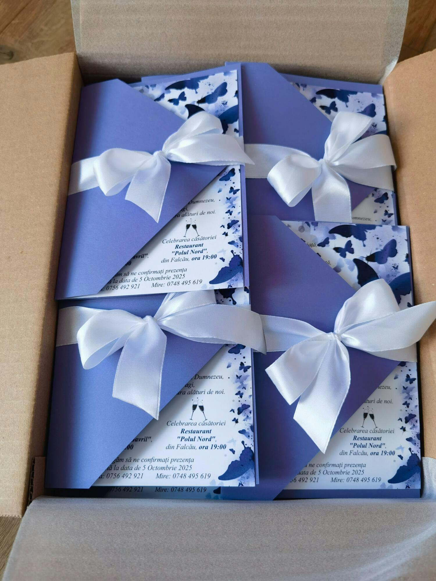 - invitație executată manual printată pe carton alb de 300g cu dimensiunea de 13x18cm,