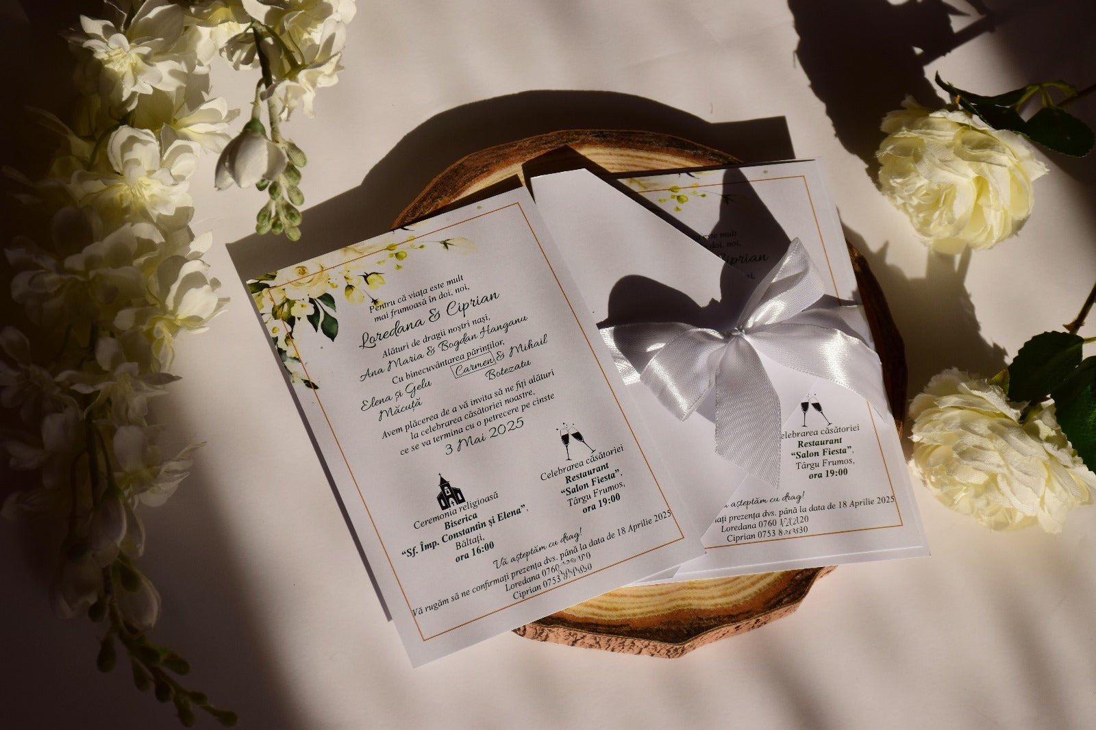 - invitație executată manual printată pe carton alb de 300g cu dimensiunea de 13x18cm,