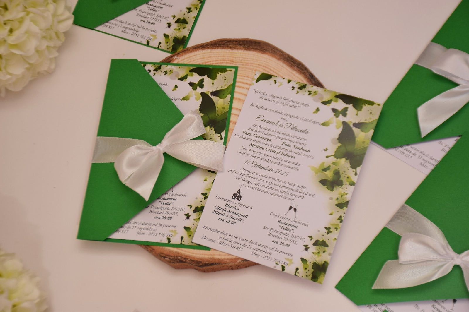 Adaugă un strop de rafinament evenimentului tău special cu această invitație de nuntă realizată manual, cu semi-plic și fundiță. Este alegerea ideală pentru cuplurile care își doresc un design elegant, personalizat și de înaltă calitate.