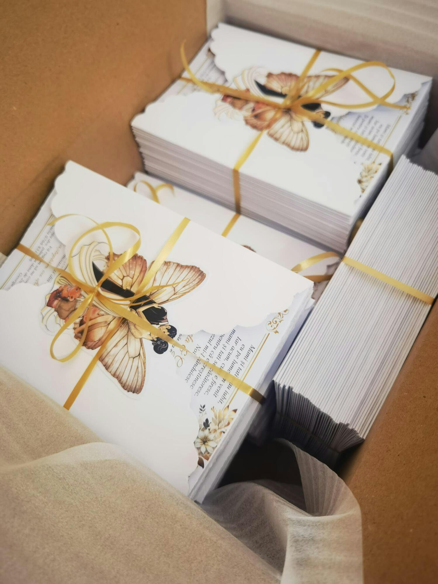 Realizată manual pe carton alb de 300g, această invitație premium are dimensiunea 13x18cm și include plic elegant personalizat cu fluture si grafică unică.