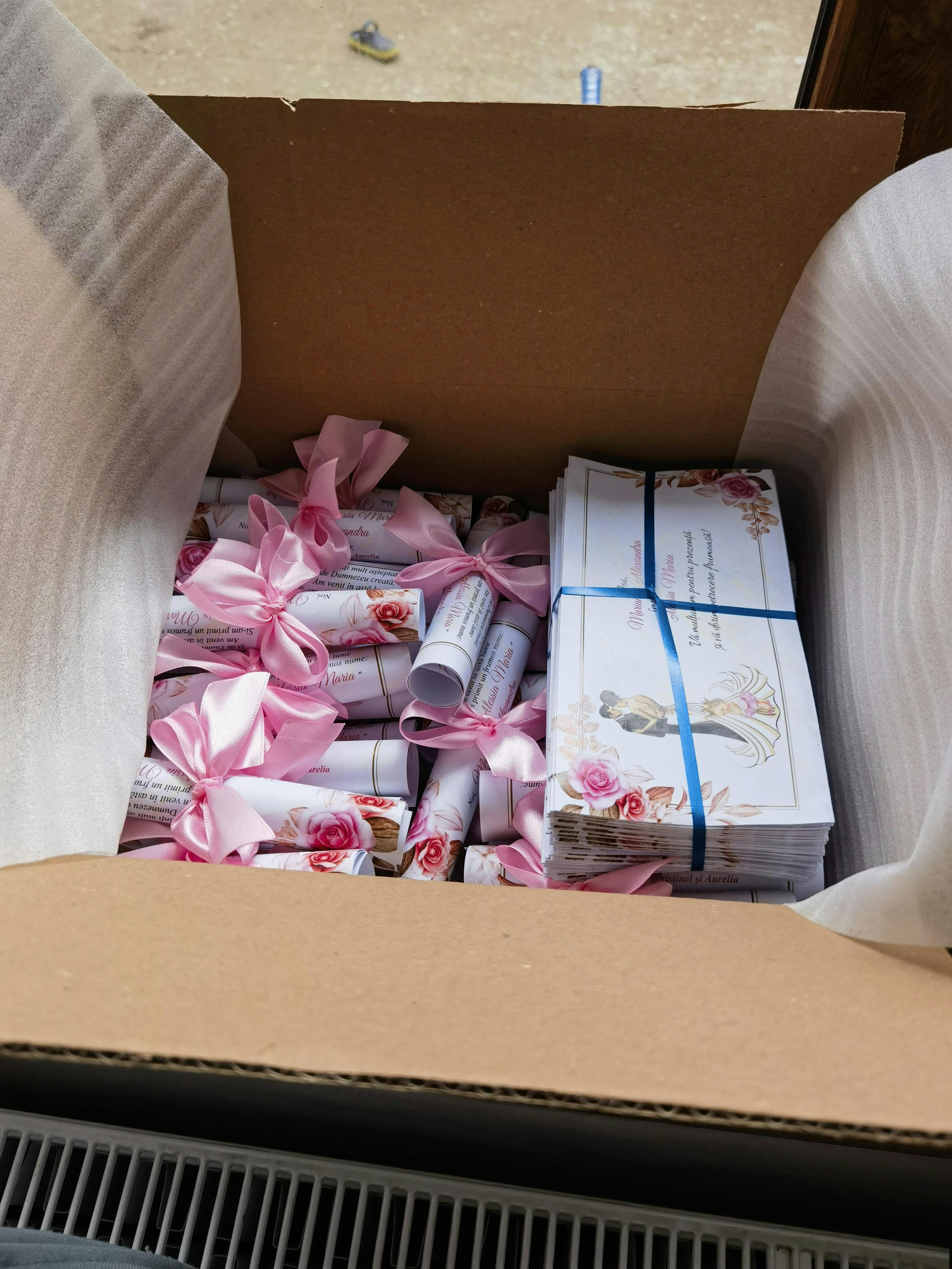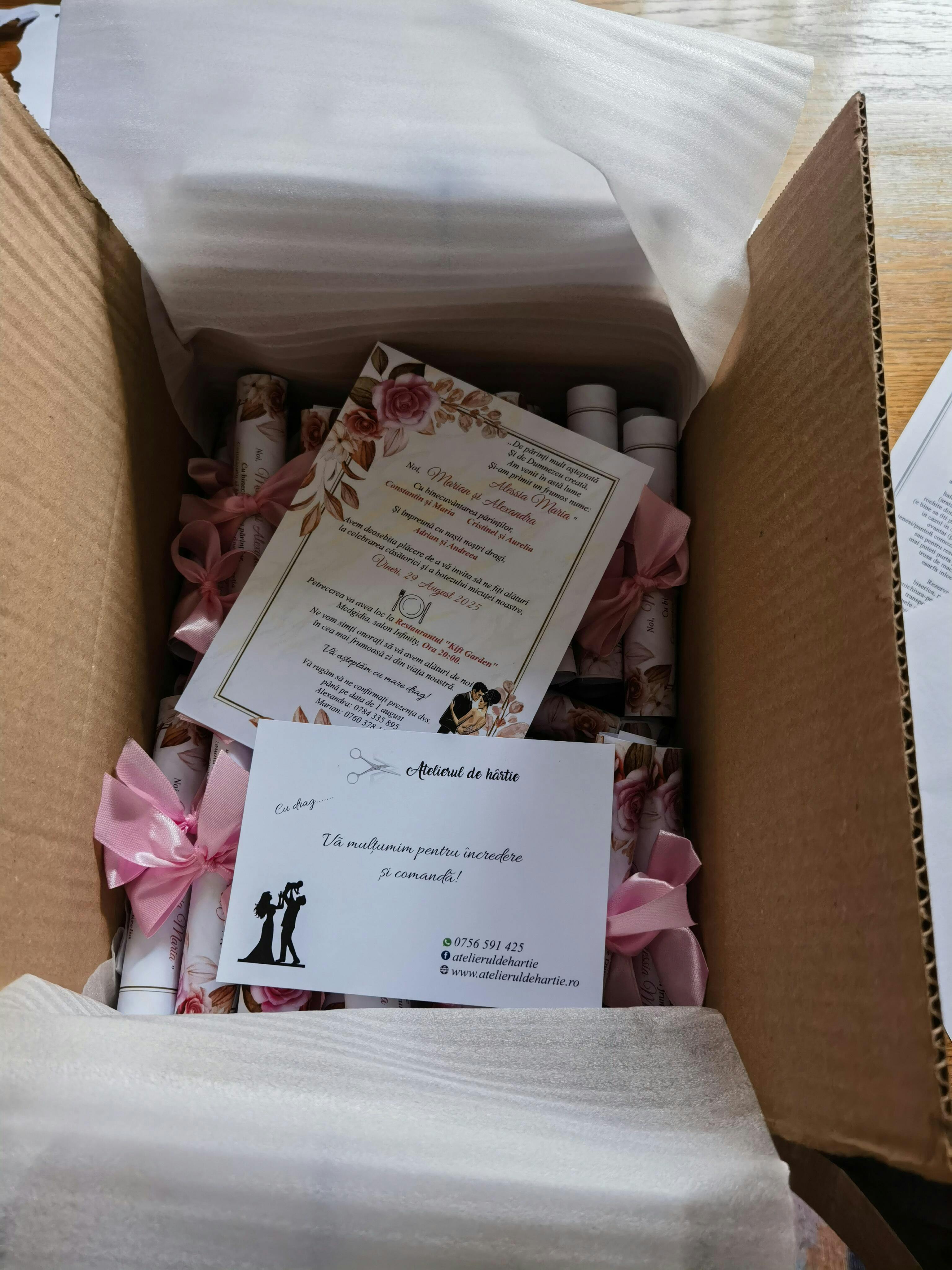 ✔️ Invitație printată și rulată manual – un concept deosebit, realizat cu grijă pentru un efect elegant cu dimensiunea de 13x18cm pe carton de 160g