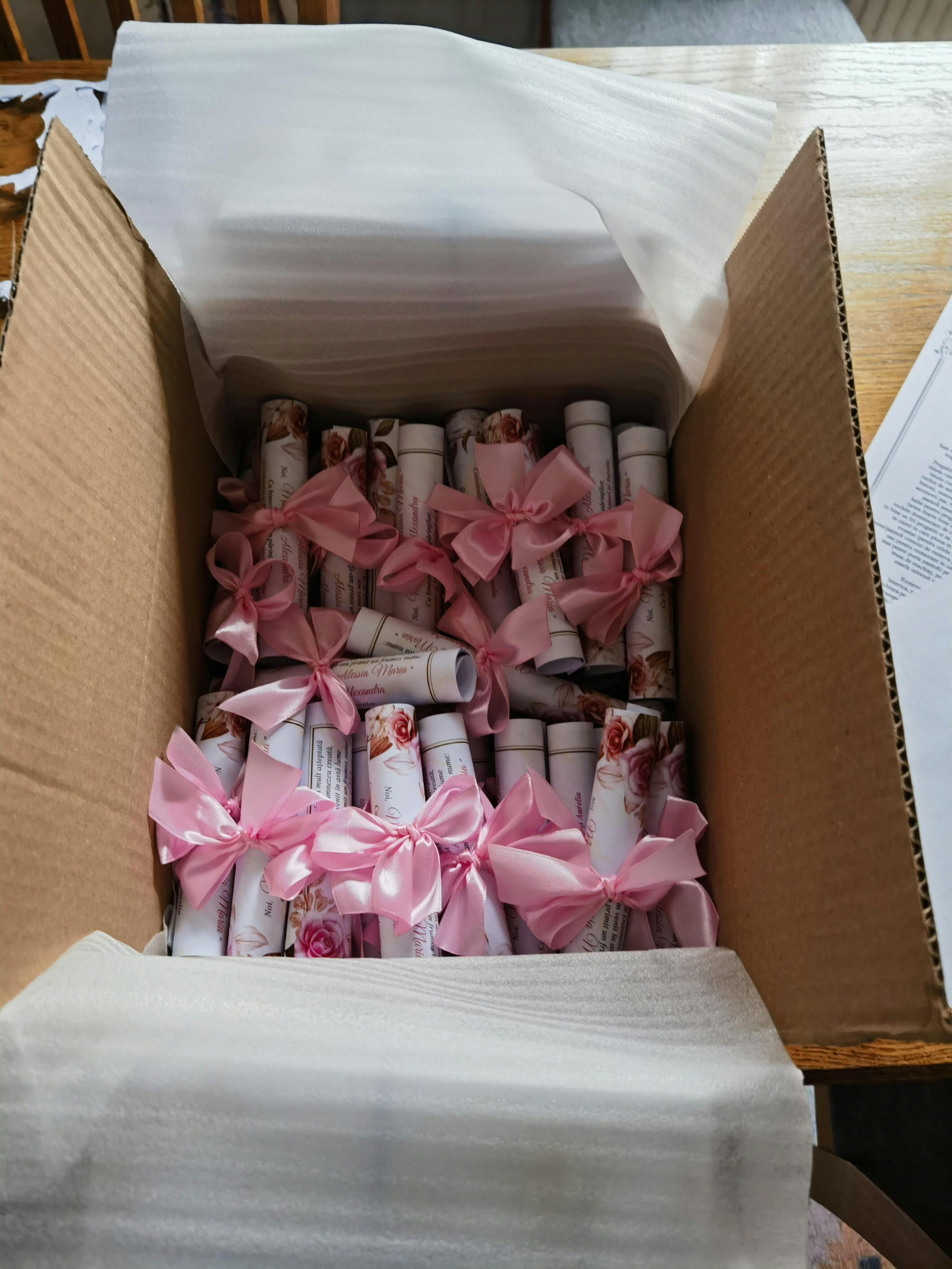 Invită cu stil la Nuntă și Botez cu o invitație rulată, decorată cu fundiță.