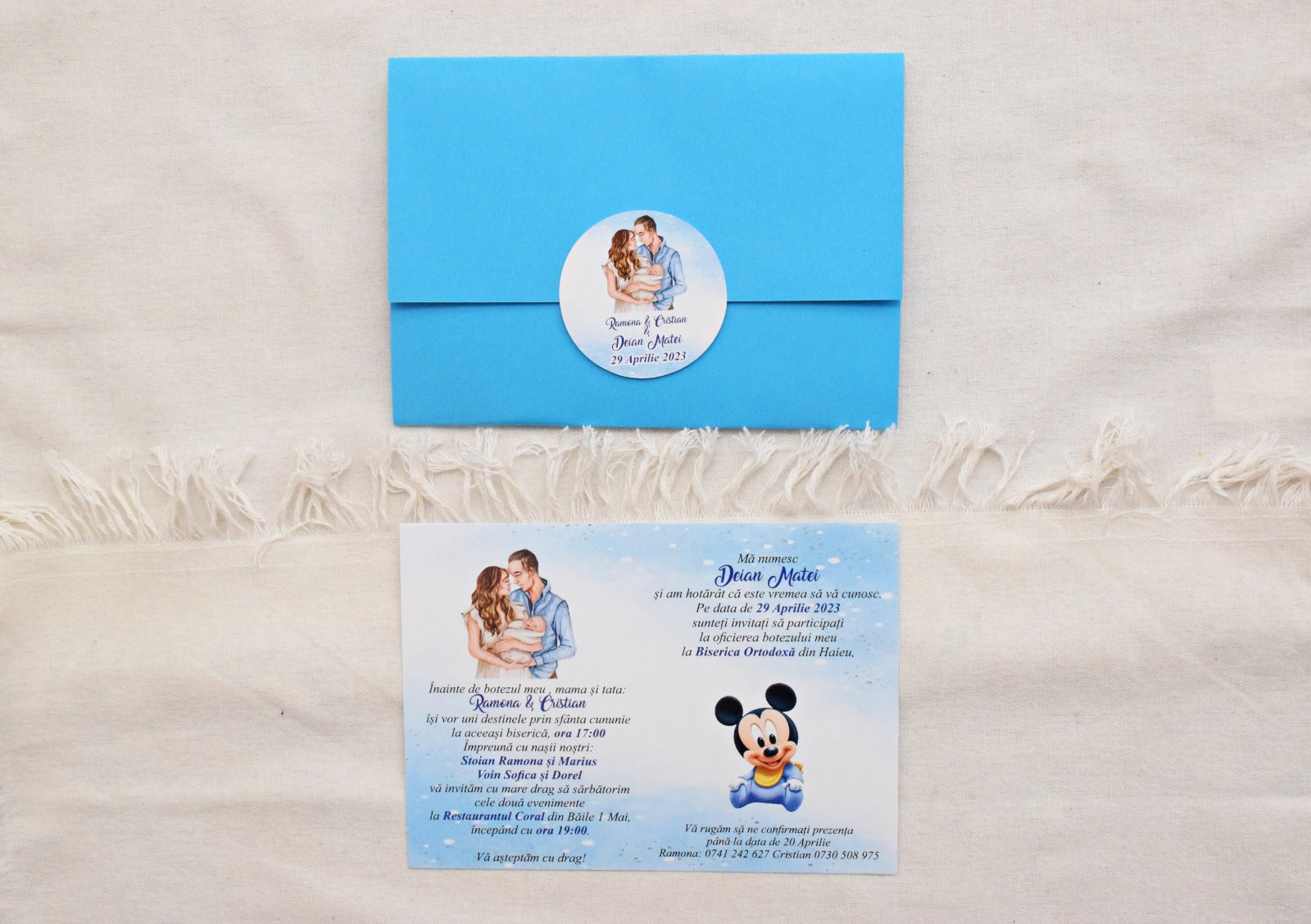 Realizată manual pe carton alb de 300g, această invitație premium are dimensiunea 13x18cm și include plic elegant, insigna personalizată cu grafică din tema Mickey.