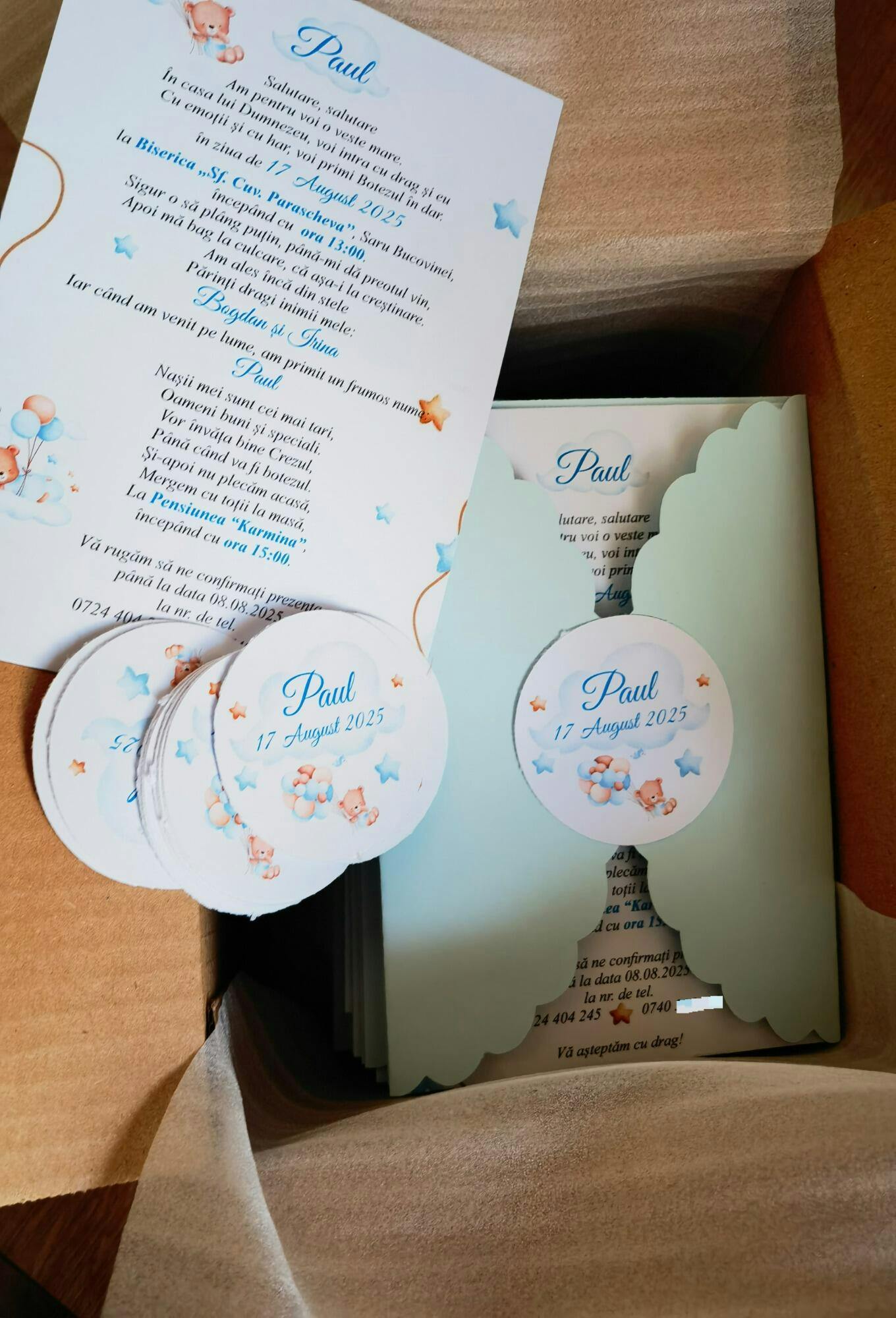 Invitație de botez cu plic si eticheta personalizata cu tema Ursulet.