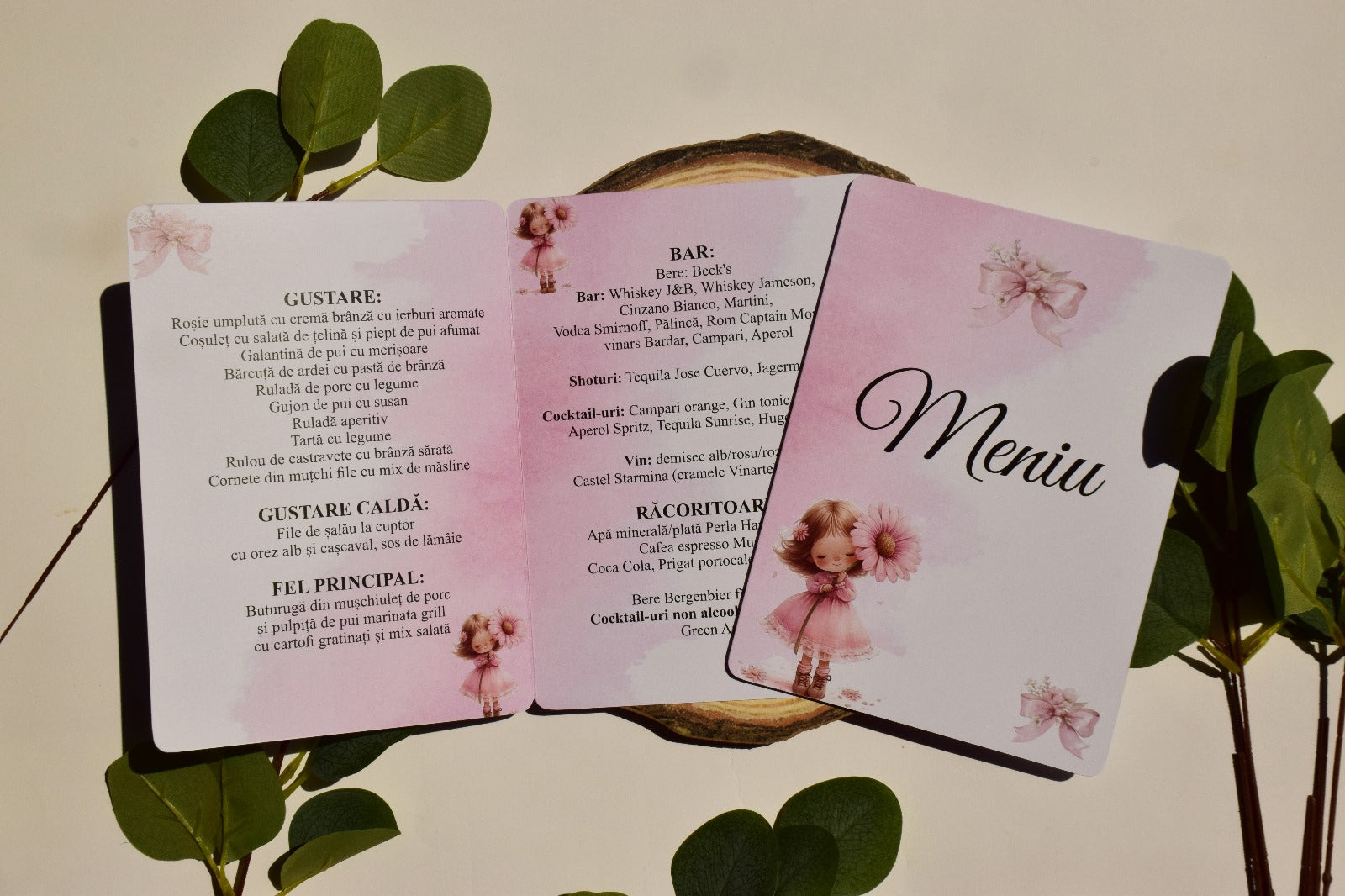 Meniu elegant pentru Botez, personalizat și imprimat pe carton premium de 300g cu 14x20cm, design asortat cu invitațiile și decorul evenimentului.