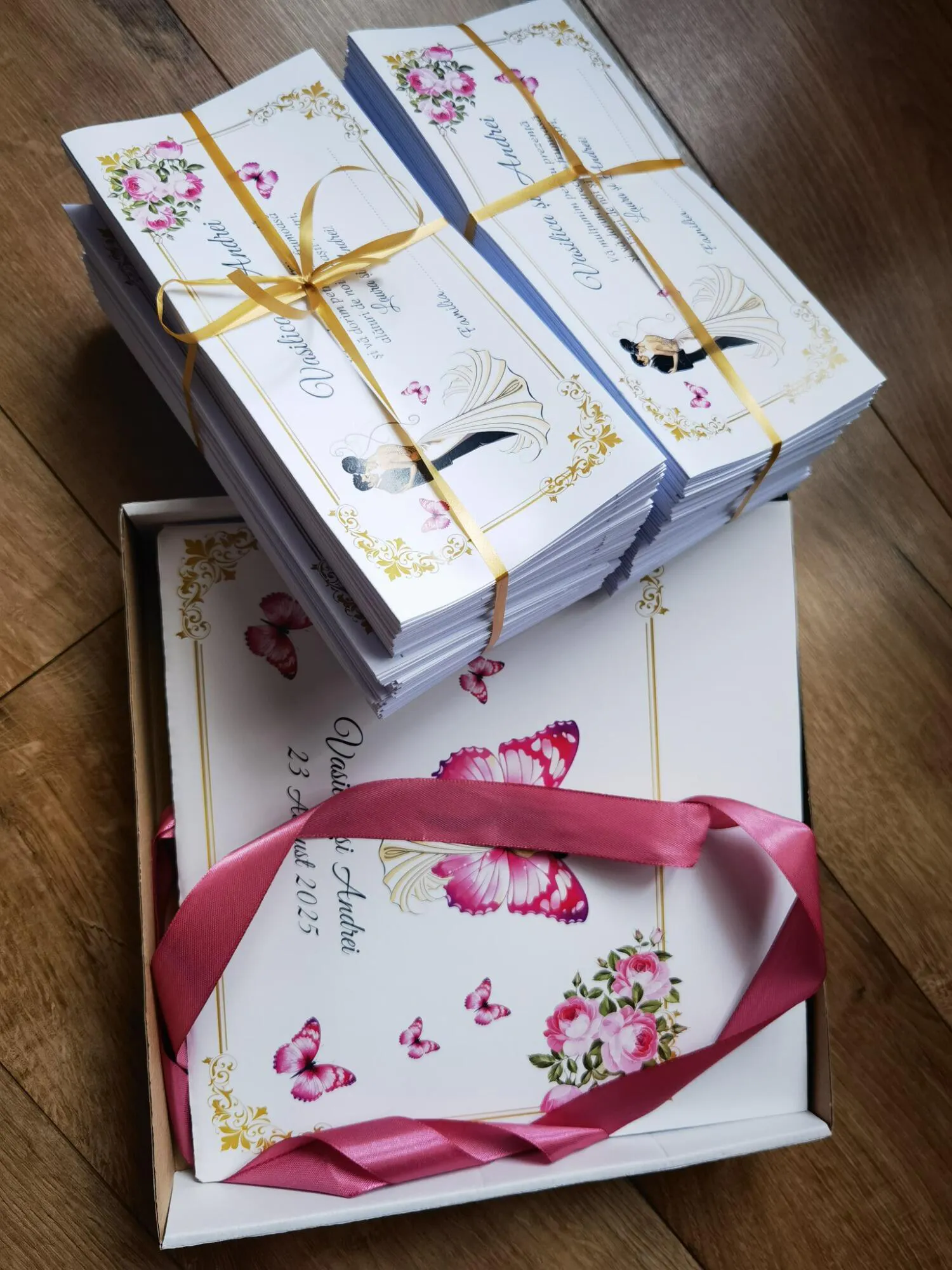 Se poate personaliza in aceeasi tema cu invitatiile, Meniuri, Numere de masă si Lista de invitati (Oglinda Sălii).