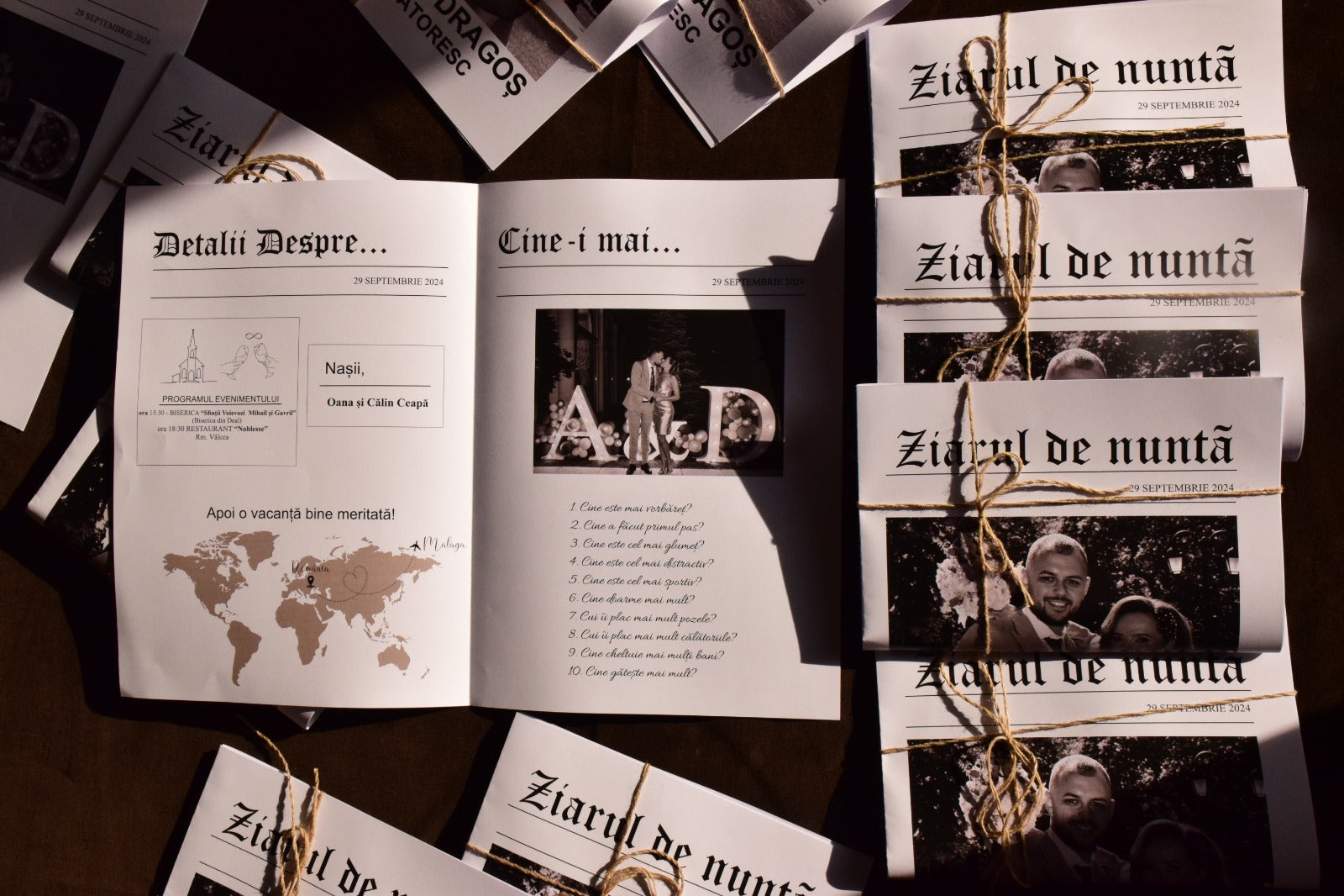 Calitate Superioară: Spre deosebire de ziarele clasice subțiri, noi folosim carton premium de 160g, oferind acea senzație de lux la atingere pe care o cauți pentru evenimentul tău.
